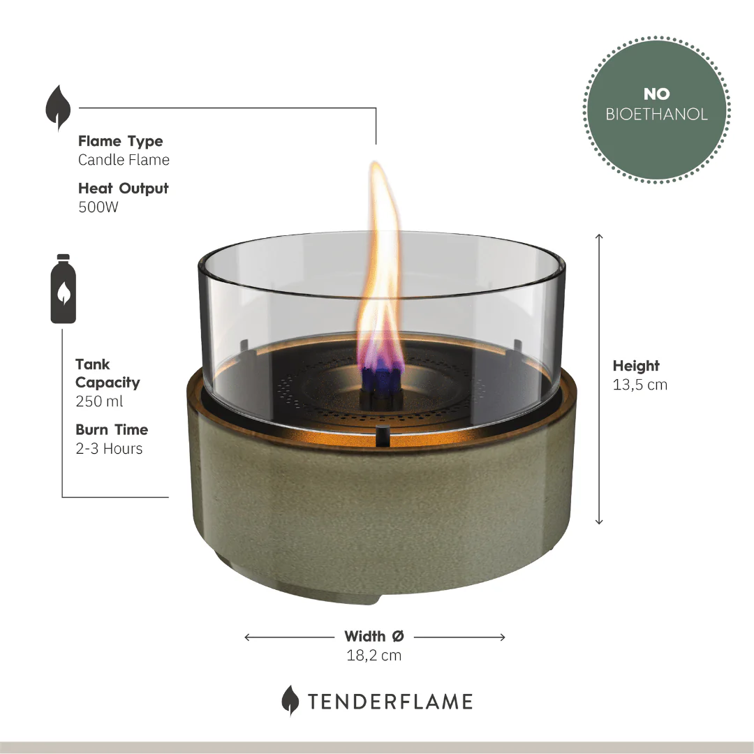 Experience the enchanting dance of flames rising elegantly from three stainless steel wicks in the Café 18. More than just a visual delight, it’s about creating unforgettable moments. Set the mood for a romantic dinner or enjoy a quiet night in as this piece adds a warm, inviting glow to your surroundings. Crafted from reactive glazed porcelain and featuring a refined glass top, the Tenderflame Café 18 combines style and safety in a round 18cm shape, perfect for enhancing your interior. The design will complement any room, making it ideal for those who love to enhance their spaces with elegant fire features. It burns exclusively on Tenderfuel, a safer alternative to bioethanol. This innovative fuel provides a clean burn without smoke, odour or soot, offering peace of mind as well as elegance. The Café 18 is the perfect choice for a cosy, stylish atmosphere in your home.
